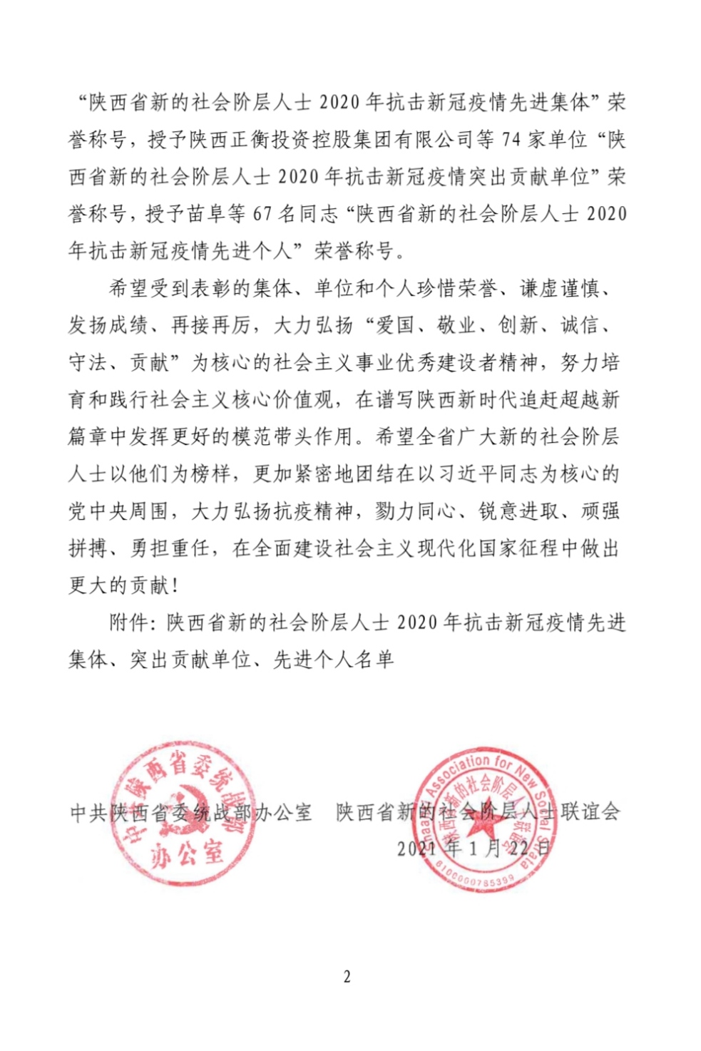 杨陵区新的社会阶层人士联谊会被评为“陕西省新的社会阶层人士2020年抗疫先进集体”,新联会理事单位陕西天科塑业科技发展有限公司被评为“突出贡献先进单位”、新联会会员蒋保国被表彰为“先进个人”。